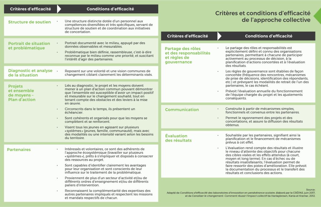 Pour générer un impact collectif positif et obtenir des résultats durables, certains critères et conditions d’efficacité doivent être recherchés. Le tableau suivant présente les critères et conditions d’efficacité de l’approche collective.
