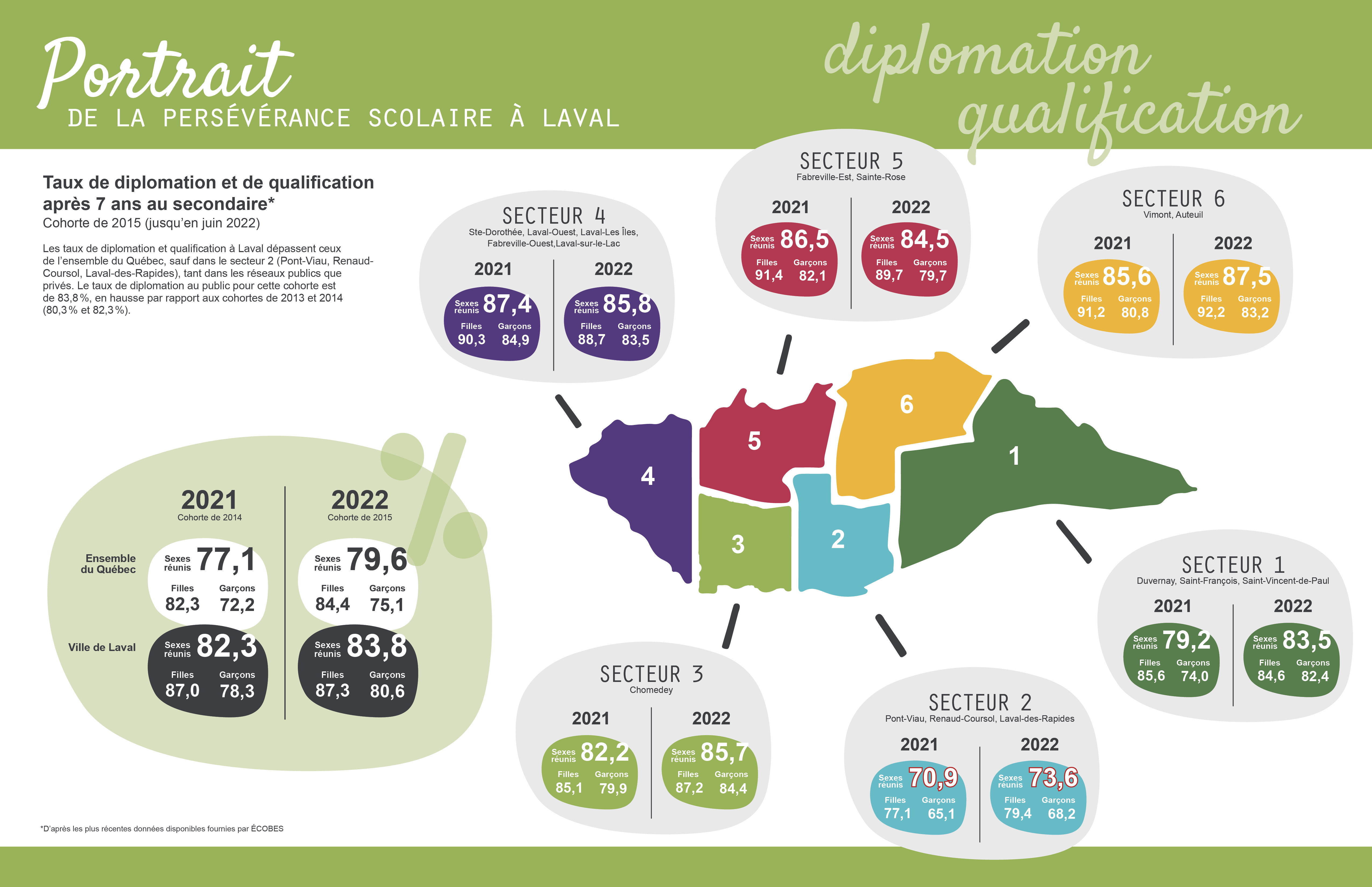 Les taux de diplomation et qualification à Laval dépassent ceux de l’ensemble du Québec, sauf dans le secteur 2 (Pont-Viau, Renaud-Coursol, Laval-des-Rapides), tant dans les réseaux publics que privés.